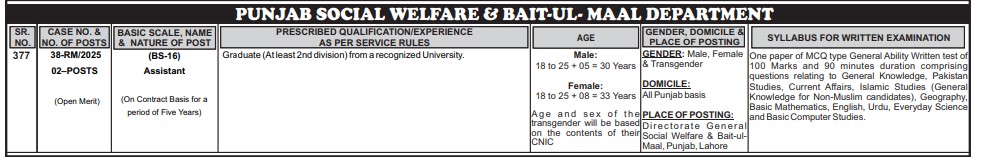 Place of Posting: Directorate General of Social Welfare & Bait-ul-Maal, Punjab, Lahore