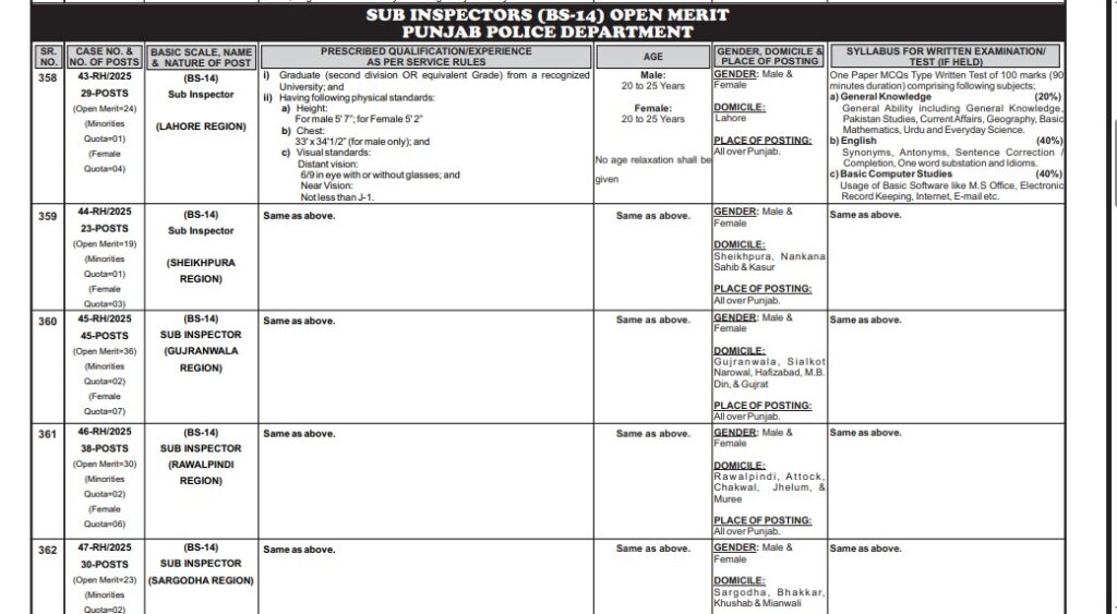 📋 Job Summary: Sub Inspector (BS-14) Punjab Police
